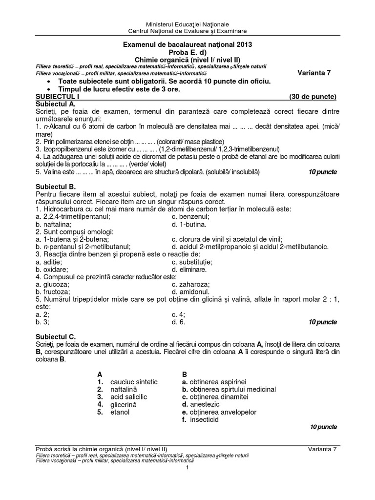 Proba E D Chimie Organica Niv I Ii Filiera Teoretica 2009 100 Variante Sub 1 2