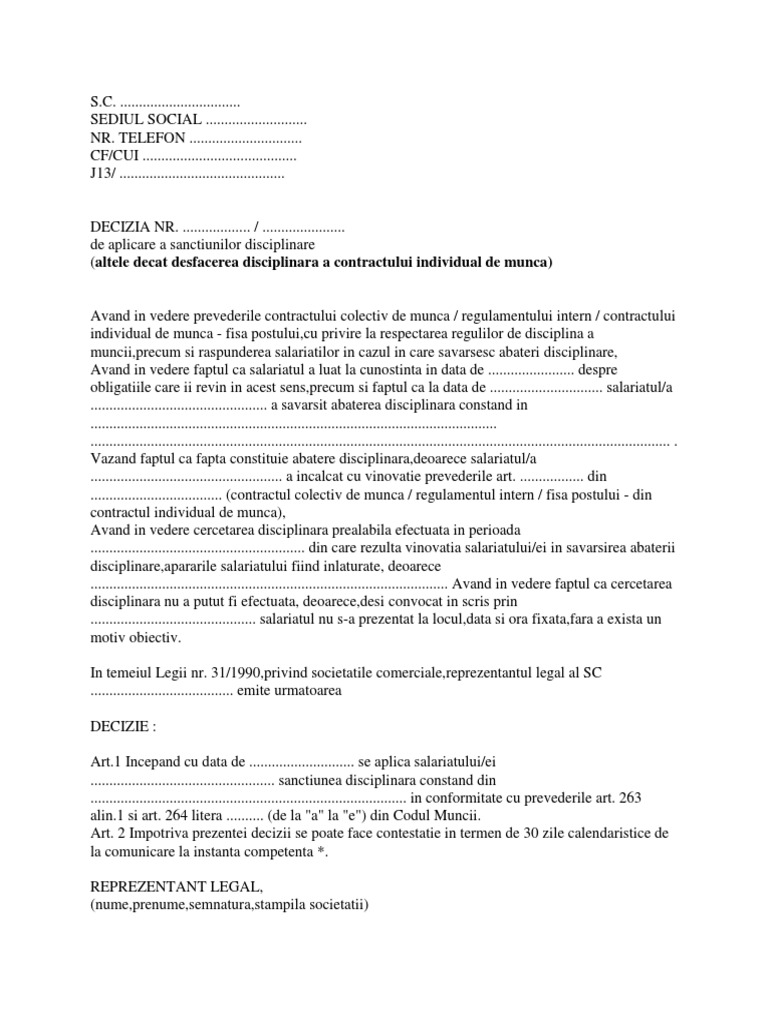 Desfacerea disciplinara a contractului individual de munca. Aplicarea sanctiunii disciplinare se face prin decizie in termen de 30 zile calendaristice de la data la care angajatorul a luat la cunostinta de savarsirea abaterii disciplinare. Conform codului muncii sanctiunile disciplinare pe care le poate aplica angajatorul in cazul in care salariatul savarseste o abatere disciplinara sunt urmatoarele. Iii retrogradarea din functie cu acordarea. Desfacerea disciplinara a contractului individual de munca fara efectuarea cercetarii disciplinare prealabile conduce la nulitatea absoluta a sanctiunii aplicate.