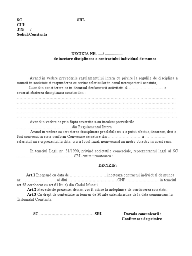 Desfacerea disciplinara a contractului de munca pronuntata de tribunalul buzau hotararea 12 din 12 03 2014. 1931 21 10 2014 si a procesului verbal nr. Esfacerea disciplinara a contractului individual de munca contracte de muncă având în vedere că nici angajatorul şi nici sindicatul sau reprezentanţii angajaţilor nu au efectuat demersurile corespunzătoare pentru obţinerea avizului deşi termenul a fost prelungit până la 31decembrie 2002 locul de muncă în care şi a desfăşurat act. Muncii desfacerea disciplinara a contractului individual de munca este posibila in doua situatii astfel.