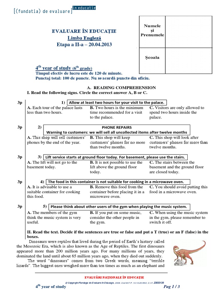 2013 Engleza Concursul Evaluare In Educatie Etapa Ii Clasa A Vi Subiecte 1 Dinosaurs Reptile