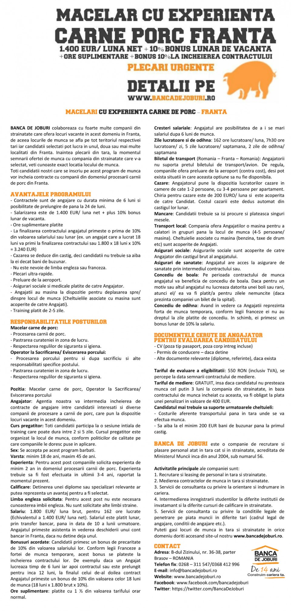 Macelari In Franta Transare Si Procesare Carne De Porc Fara Comisioane Salarii Si Conditii De Munca Foarte Bune Plecari Saptamanale In Limita Locurilor Disponibile Banca De Joburi Aplica Pe Ejobs