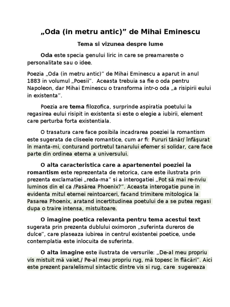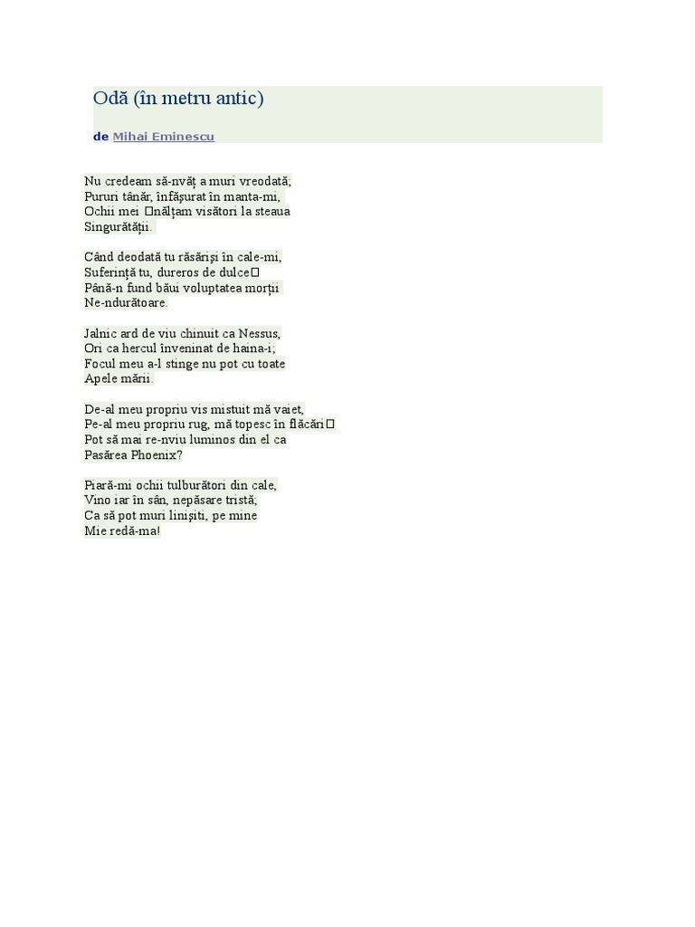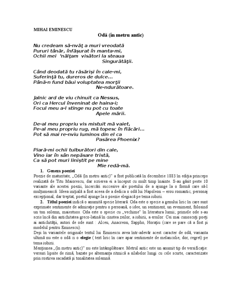 Odă In Metrul Antic De Mihai Eminescu Comentariu