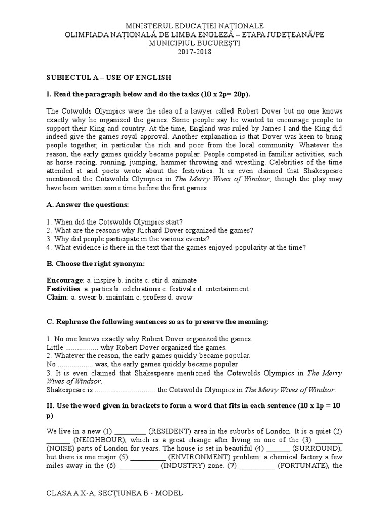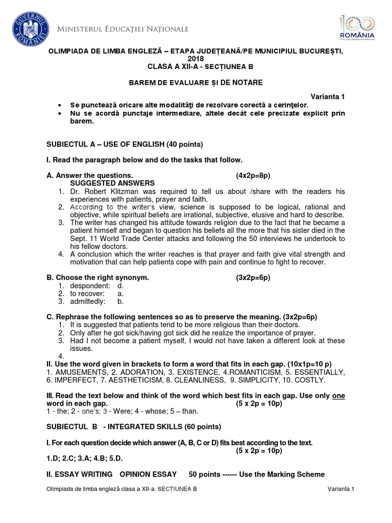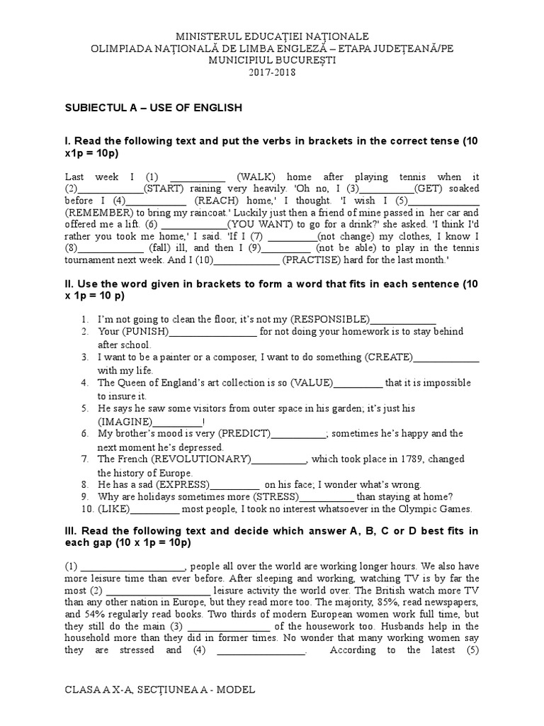 Olimpiada Judeteana De Limba Engleza 2018 Clasa A X A Ssectiunea B Barem Vocabulary Essays