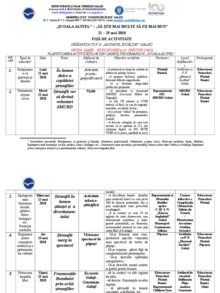 Planificare Grupa Mare Scoala Altfel 2017 2018 Prof Craciun Oana