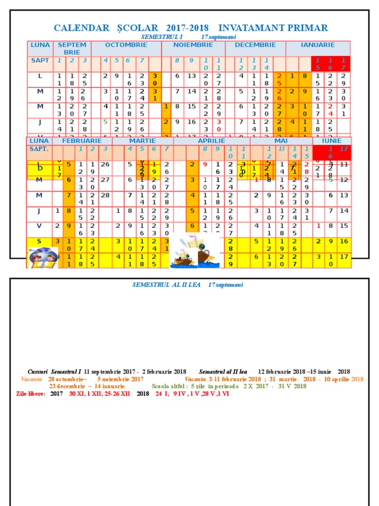Calendar Scolar 2017 2018 Invatamant Primar Luna Septem Brie Octombrie Noiembrie Decembrie Ianuarie Sapt